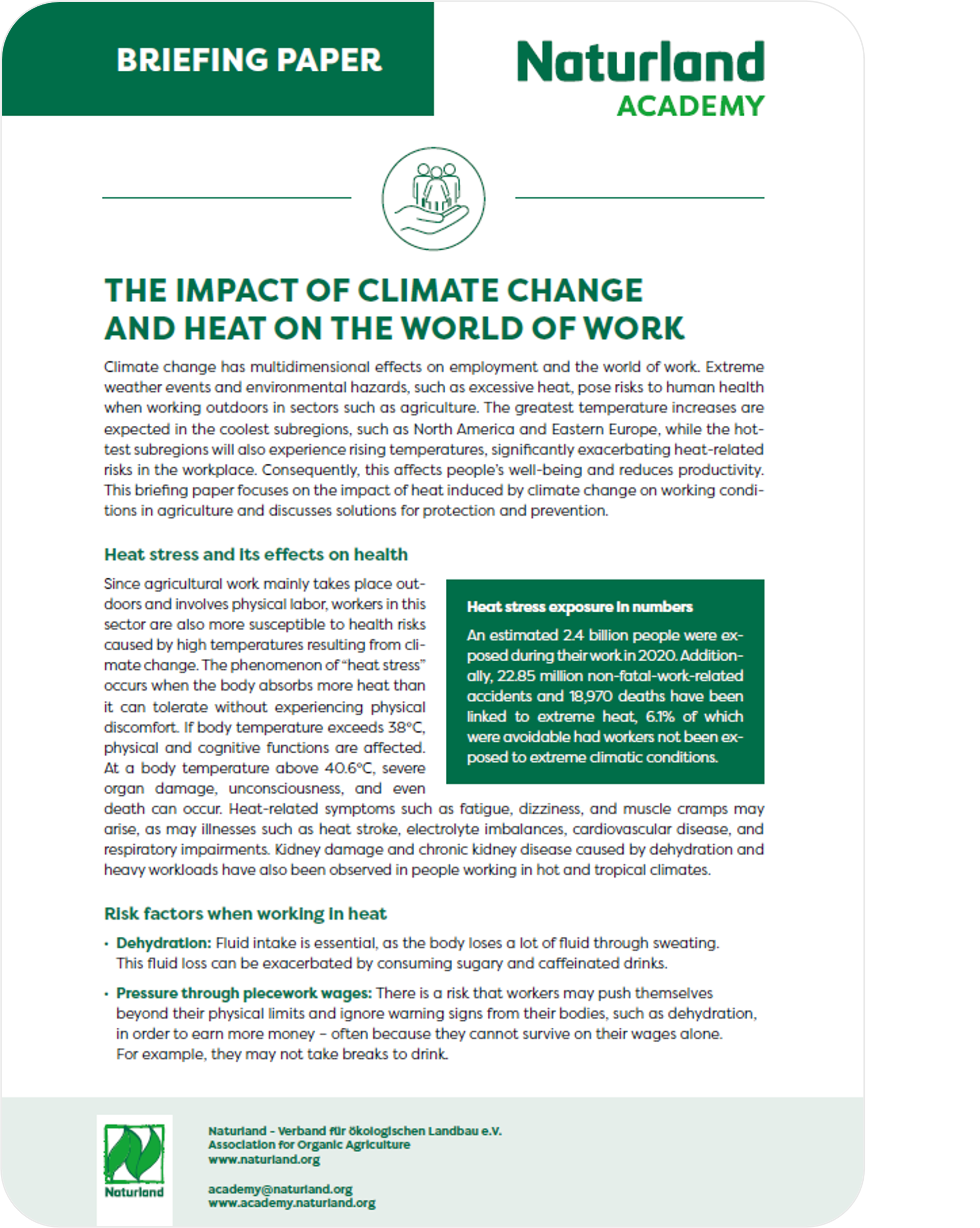 Naturland provides a briefing paper summarizing key insights on heat and stress in agricultural working conditions. You can also access the recordings and presentation slides from the seminar to deepen your understanding of the topic.Naturland ofrece un documento informativo que resume los principales conocimientos sobre el calor y el estrés en las condiciones laborales agrícolas. También puede acceder a las grabaciones y presentaciones del seminario para profundizar en el tema.
